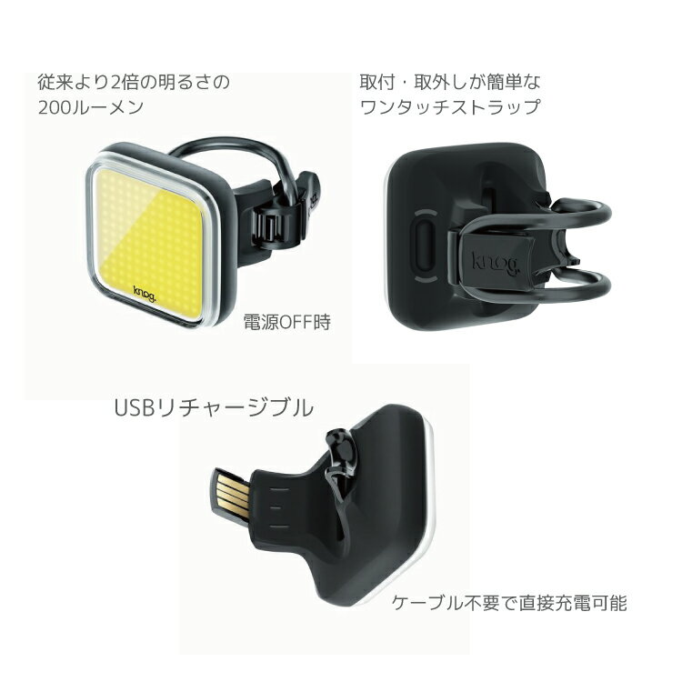 〜第三世代のBLINDERのここがスゴイ!〜 ●デザインの力で安全性とかっこよさを両立する ●BLINDER MOBよりも明るさは2倍 ●最大光量のランタイムも1.5倍に延長 品名 【 Knog 】New Blinder Front ( ブラインダー フロント ) ライト 品番 BLINDER-FRONT サイズ(cm) LED面サイズ: 4cm×4cm モデル GRID ( グリッド ) SKULL ( スカル ) SQUARE ( スクウェア ) X ( エックス ) 最大光量 200ルーメン 搭載LEDランプ COB(Chip on Board)LED搭載 連続点灯時間 Steadyモード 2.5時間 Eco Flashモード 55時間 重量 34g 充電時間 4時間〜5時間 点灯パターン 8種類のモードパターンと明るさ設定 ※SKULLのみ9種類のモード 仕様 100%防水 ライト本体のUSBプラグからケーブル不要で直接充電可能 KNOGらしいユニークなパターンで、自転車の存在を周りに知らせます ワンタッチで取付け可能なハンドル径22〜40mmに対応のシリコンストラップアタッチメント バッテリー残量減少時に電源を切った後2秒間点灯するバッテリーインジケーター搭載 あらゆるバイクにフィットするスリムなBLINDERの基本デザインはそのまま継承 ユニークなデザインが特徴の第三世代BLINDERが登場。