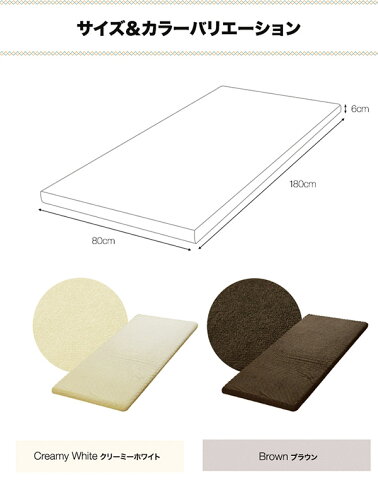 ※[店舗管理用 URL]a11540※[品番]【ブラウン:a11540】【クリーミーホワイト:a11541】 カラー: ・クリーミーホワイト ・ブラウン サイズ (約)80cm×180cm×6cm 材質(マットレス): 高反発ウレタン(密度27kg/m3) 材質(カバー):ポリエステル100% 重量: (約)2.2kg 特記事項: ※圧縮梱包されたままの状態で長期間保管した場合、マットレスが復元できなくなってしまいます。