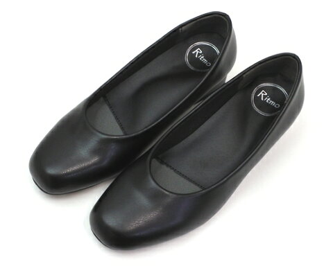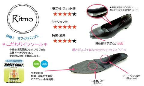 高反発ウレタンの立体アーチクッションインソール 履き心地抜群で疲れにくい 制菌・消臭加工素材バクテシャットを使用 安定感のある低めのヒールであるきやすい 丸みのあるスクエアトゥ プレーントゥ滑り止めが付いたアウトソール 幅広 ブラックパンプス 黒パンプス